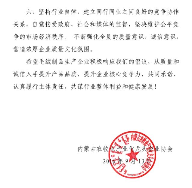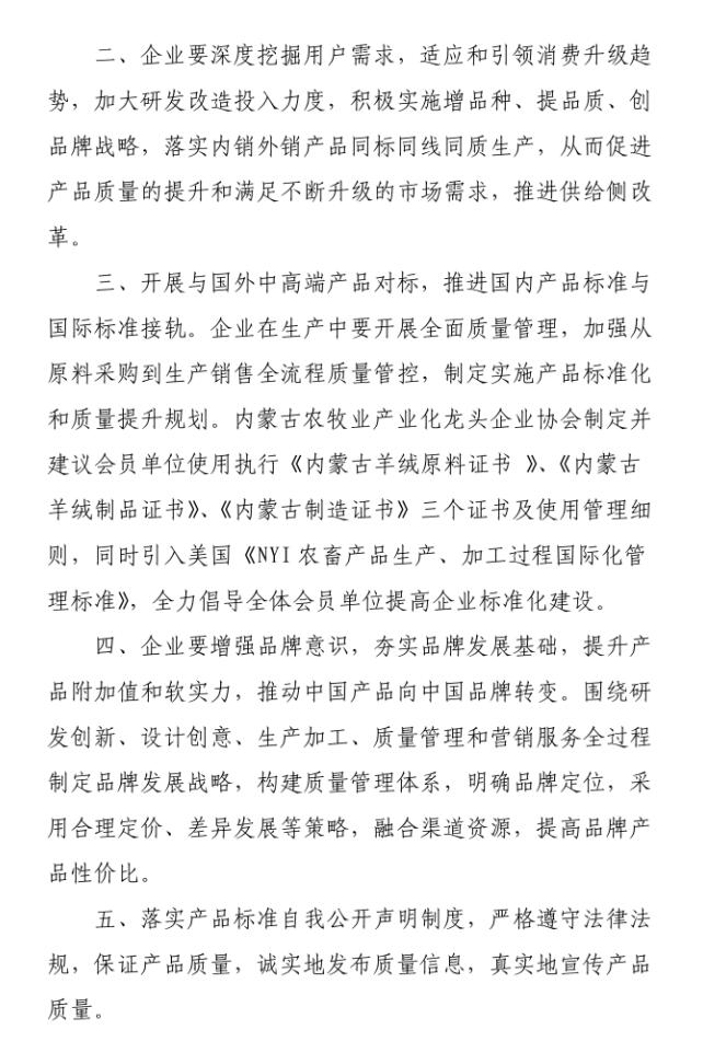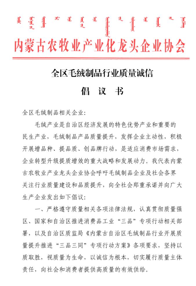 會(huì)上,質(zhì)監(jiān)局質(zhì)量監(jiān)督處副處長(zhǎng)艾繼青宣讀國(guó)務(wù)院辦公廳《關(guān)于開展消費(fèi)品工業(yè)“三品”專項(xiàng)行動(dòng)營(yíng)造良好市場(chǎng)環(huán)境的若干意見》;孫磐處長(zhǎng)向與會(huì)人員通報(bào)了近年羊絨監(jiān)督抽查的質(zhì)量狀況基本情況,并傳達(dá)了內(nèi)蒙古質(zhì)監(jiān)局印發(fā)的毛絨制品行業(yè)質(zhì)量提升推進(jìn)“三品三同”專項(xiàng)行動(dòng)方案;纖維檢驗(yàn)局總工程師曹渭芳介紹了纖檢局助力企業(yè)產(chǎn)品質(zhì)量提升檢驗(yàn)?zāi)芰Φ姆?wù)舉措;協(xié)會(huì)副會(huì)長(zhǎng)、羊絨分會(huì)名譽(yù)會(huì)長(zhǎng)單位鄂爾多斯羊絨集團(tuán),協(xié)會(huì)副會(huì)長(zhǎng)、內(nèi)蒙古鹿王羊絨制品有限公司及內(nèi)蒙古豐蒂妮羊絨制品有限公司三家企業(yè)相關(guān)負(fù)責(zé)人介紹了各自企業(yè)在落實(shí)國(guó)家和自治區(qū)羊絨產(chǎn)業(yè)政策、加快企業(yè)轉(zhuǎn)型升級(jí)和產(chǎn)品質(zhì)量提升方面的先進(jìn)經(jīng)驗(yàn);內(nèi)蒙古農(nóng)牧業(yè)產(chǎn)業(yè)化龍頭企業(yè)協(xié)會(huì)常務(wù)秘書長(zhǎng)劉俊青代表行業(yè)協(xié)會(huì)向全區(qū)毛絨制品相關(guān)企業(yè)發(fā)起全區(qū)毛絨制品行業(yè)誠(chéng)信倡議書,呼吁毛絨制品企業(yè)從質(zhì)量和誠(chéng)信入手,提升產(chǎn)品品質(zhì),提升企業(yè)核心競(jìng)爭(zhēng)力,認(rèn)真履行責(zé)任,共同推進(jìn)行業(yè)整體利益和健康發(fā)展。