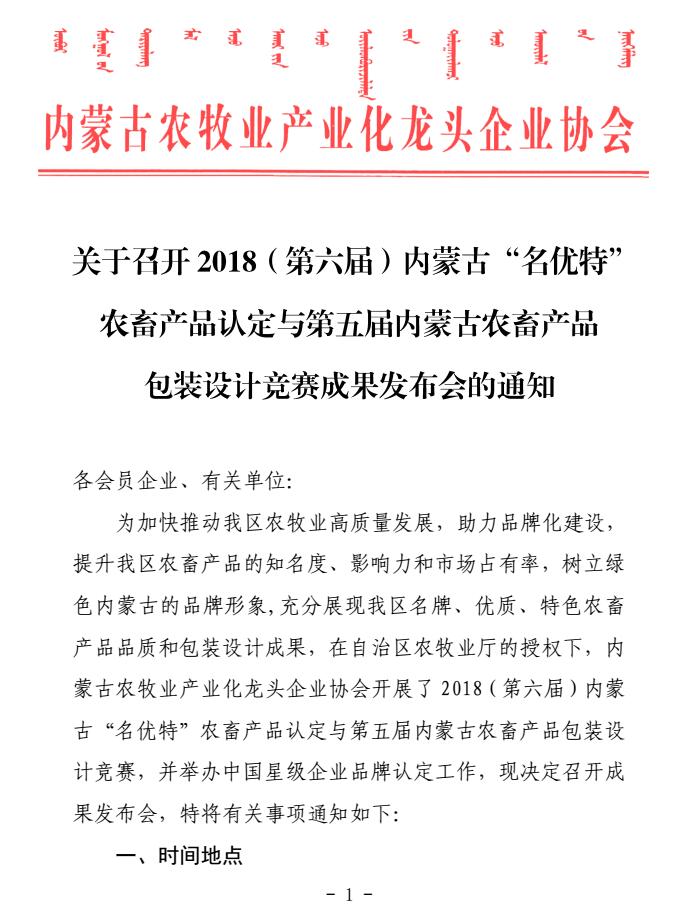 標(biāo)題:關(guān)于召開(kāi)2018(第六屆)內(nèi)蒙古“名優(yōu)特”農(nóng)畜產(chǎn)品認(rèn)定與第五屆內(nèi)蒙古農(nóng)畜產(chǎn)品包裝設(shè)計(jì)競(jìng)賽成果發(fā)布會(huì)的通知