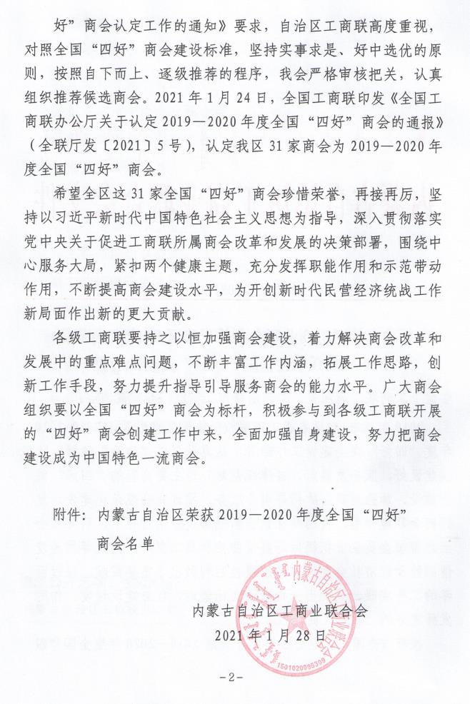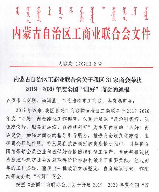 標(biāo)題:喜報(bào)!內(nèi)蒙古農(nóng)牧業(yè)產(chǎn)業(yè)化龍頭企業(yè)協(xié)會(huì)榮獲全國“四好”商會(huì)榮譽(yù)稱號(hào)