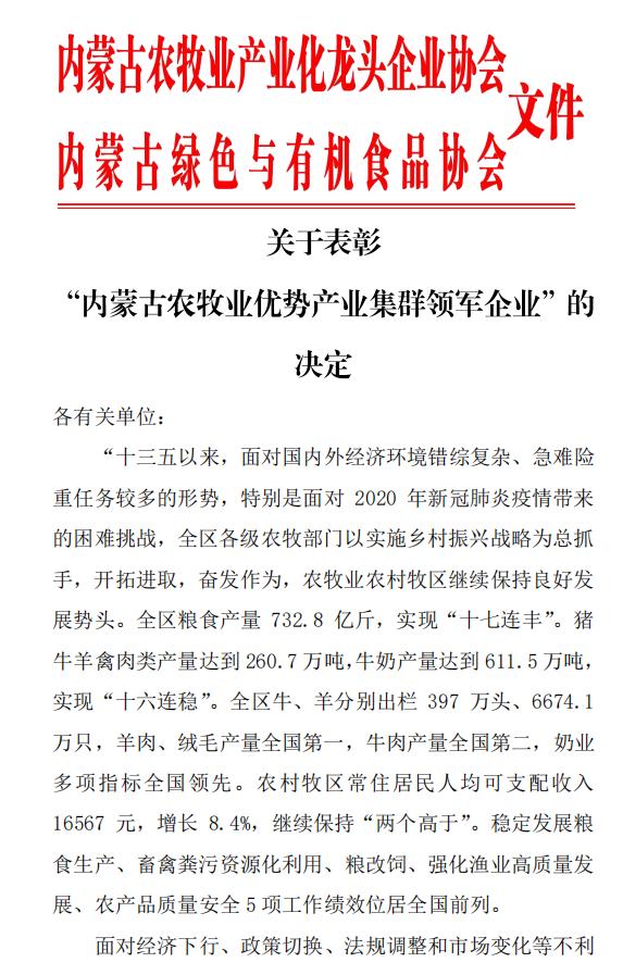 “內(nèi)蒙古農(nóng)牧業(yè)優(yōu)勢產(chǎn)業(yè)集群領(lǐng)軍企業(yè)”