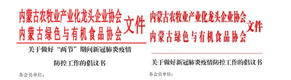 一、內蒙古農牧業(yè)產業(yè)化龍頭企業(yè)協會聯合內蒙古綠色與有機食品協會,先后發(fā)布了《關于做好“兩節(jié)”期間新冠肺炎疫情防控工作的倡議書》和《關于做好新冠肺炎疫情防控工作的倡議書》,引導各會員單位堅決遏止借機囤積居奇、哄抬物價、虛假宣傳等破壞市場秩序、損害消費者合法權益的不法行為,堅決遏制疫情擴展蔓延,積極投身新型冠狀病毒防控戰(zhàn)役中。