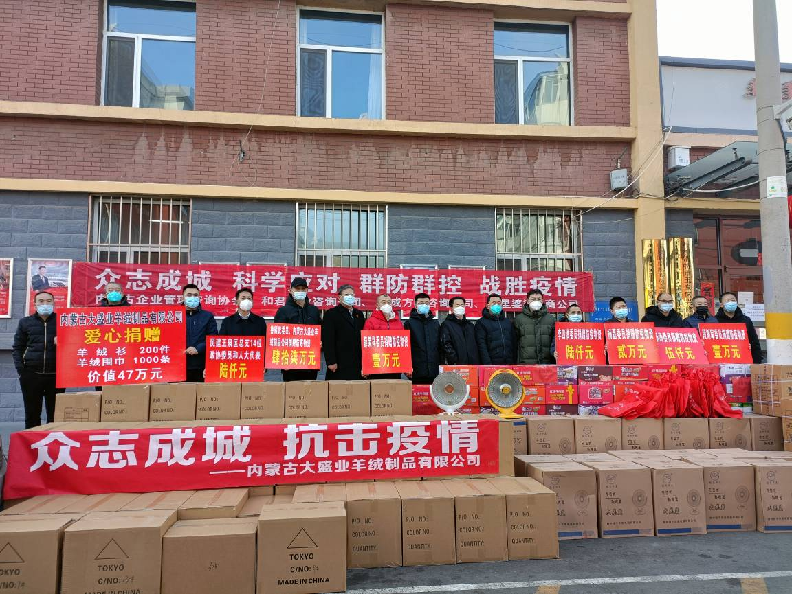 6、副會長單位-內蒙古大盛業(yè)羊絨制品有限公司:2月21日,將價值47萬元的200件羊絨衫、1000條羊絨圍巾捐贈給玉泉區(qū)紅十字會,為抗疫人員送去溫暖。