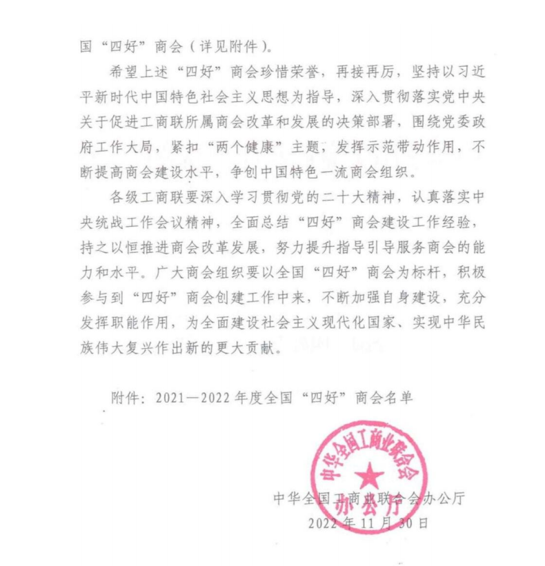 近日,中華全國工商業(yè)聯(lián)合會辦公廳發(fā)布《關(guān)于認定20212022年度全國“四好”商會的通報》,通報指出,按照全國“四好”商會認定標準,在各地工商聯(lián)逐級推薦、省級工商聯(lián)審核把關(guān)、全國工商聯(lián)組織評審的基礎(chǔ)上,經(jīng)全國工商聯(lián)主席辦公會議審議通過,評選出2021-2022年度全國“四好”商會。內(nèi)蒙古農(nóng)牧業(yè)產(chǎn)業(yè)化龍頭企業(yè)協(xié)會等42家商(協(xié))會榮獲2021-2022年度全國“四好”商會榮譽稱號!