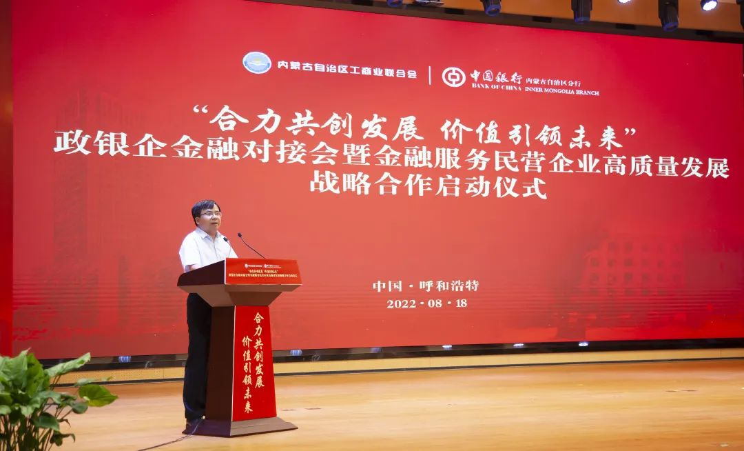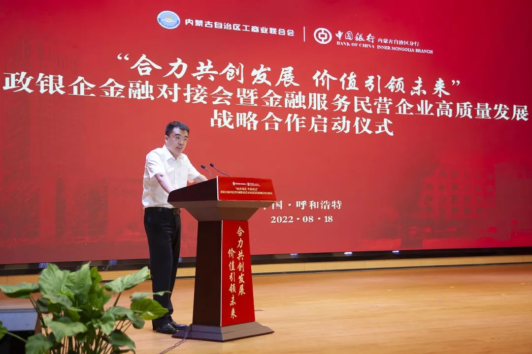 胡文勇行長(zhǎng)在開(kāi)場(chǎng)致辭中表示,一直以來(lái),自治區(qū)工商聯(lián)充分發(fā)揮統(tǒng)戰(zhàn)性、經(jīng)濟(jì)性、民間性綜合優(yōu)勢(shì),團(tuán)結(jié)和帶領(lǐng)廣大非公有制經(jīng)濟(jì)人士,與時(shí)俱進(jìn),大膽創(chuàng)新,努力實(shí)踐,推動(dòng)優(yōu)化營(yíng)商環(huán)境,促進(jìn)我區(qū)非公有制經(jīng)濟(jì)又好又快發(fā)展,為全面建設(shè)小康社會(huì)、構(gòu)建和諧社會(huì)作出重要貢獻(xiàn)。作為唯一一家持續(xù)經(jīng)營(yíng)超過(guò)百年的國(guó)有大行,中國(guó)銀行秉承“融通世界、造福社會(huì)”的崇高使命,將自身發(fā)展與地方經(jīng)濟(jì)發(fā)展緊密相連,主動(dòng)擔(dān)當(dāng)服務(wù)支持民營(yíng)企業(yè)發(fā)展壯大的金融重任。未來(lái),中國(guó)銀行內(nèi)蒙古區(qū)分行將繼續(xù)深耕細(xì)作民營(yíng)經(jīng)濟(jì)領(lǐng)域的融資服務(wù),在普惠金融、科技金融、綠色金融等領(lǐng)域加強(qiáng)金融支持,緩解小微企業(yè)“融資難、融資貴”問(wèn)題,助企紓困,風(fēng)雨同舟,為深化政銀企合作共贏發(fā)展貢獻(xiàn)新力量!