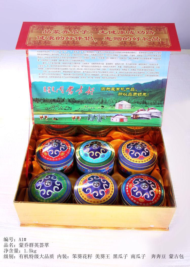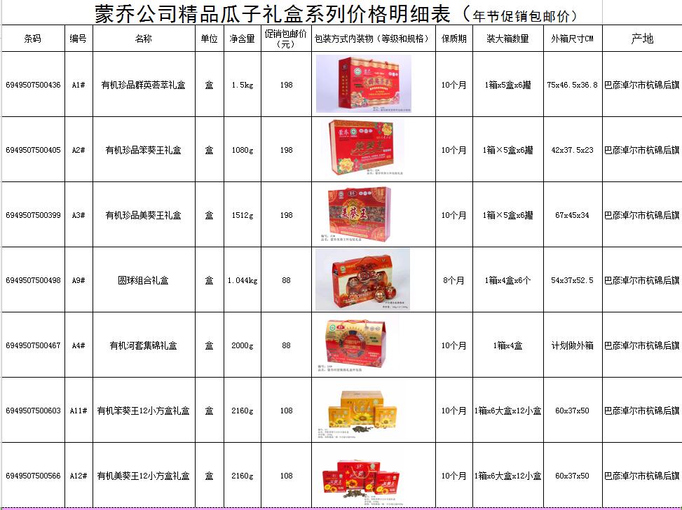 呼市鄂爾多斯大街石羊橋十字路西移動大廳西20米北巷,現(xiàn)有大量年節(jié)禮品盒:巴盟有機葵花子禮盒低價促銷包郵,聯(lián)系電話:15334782928,十盒包郵,價格如下: