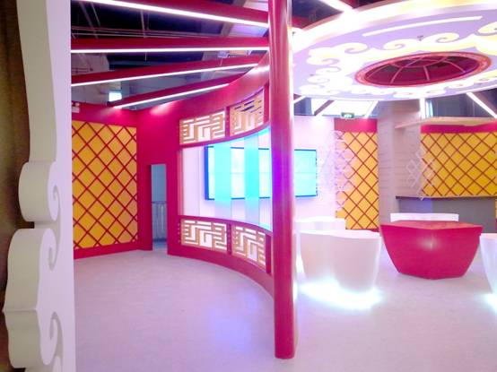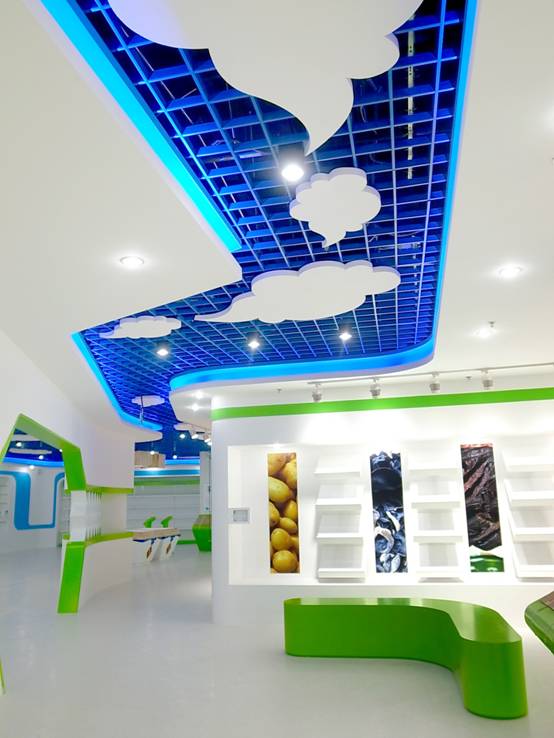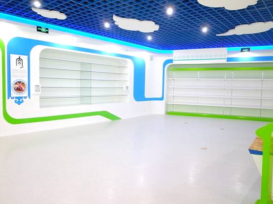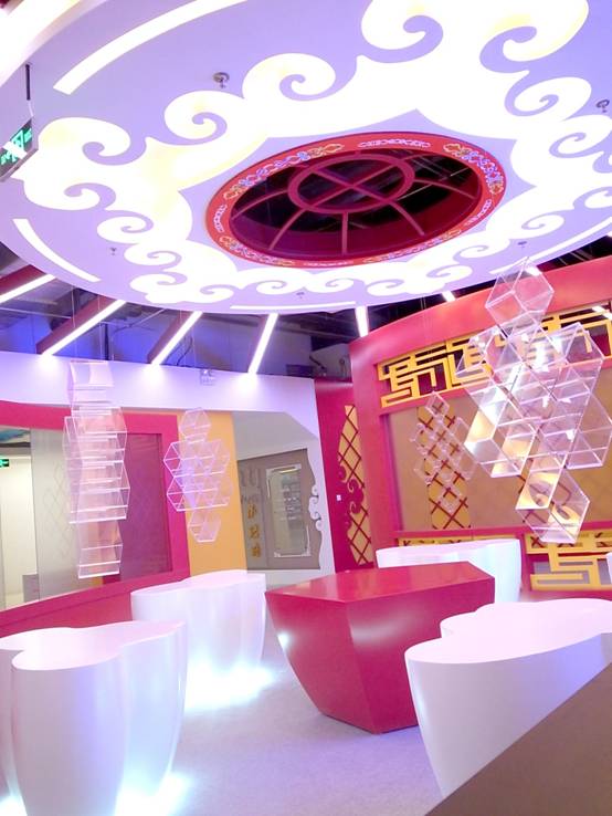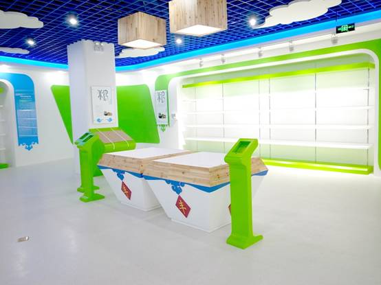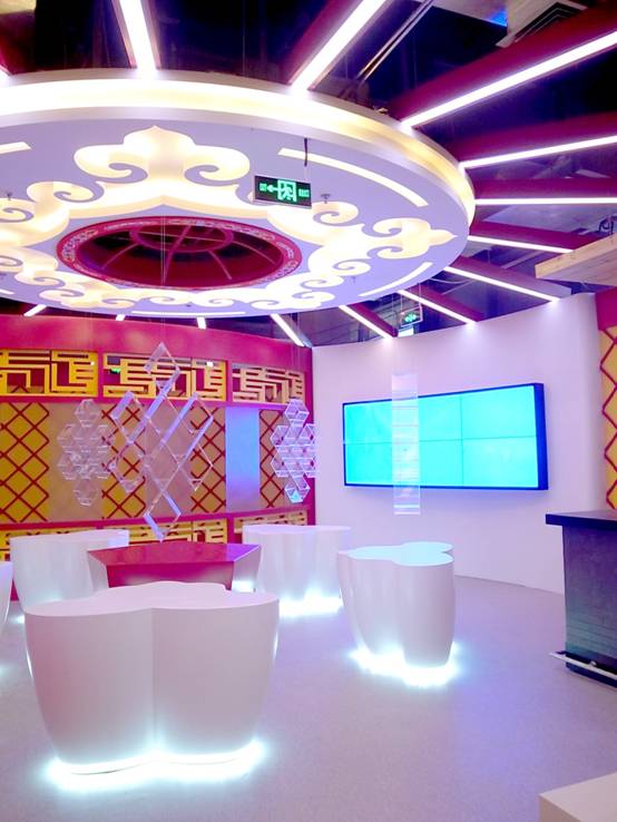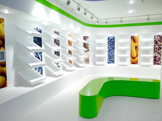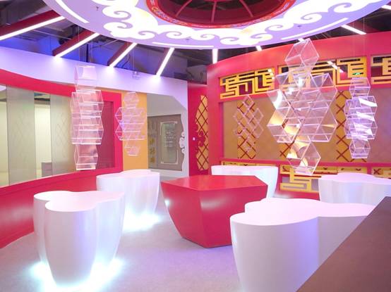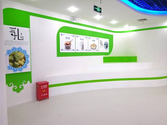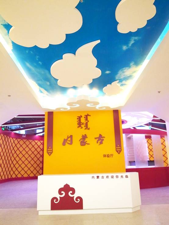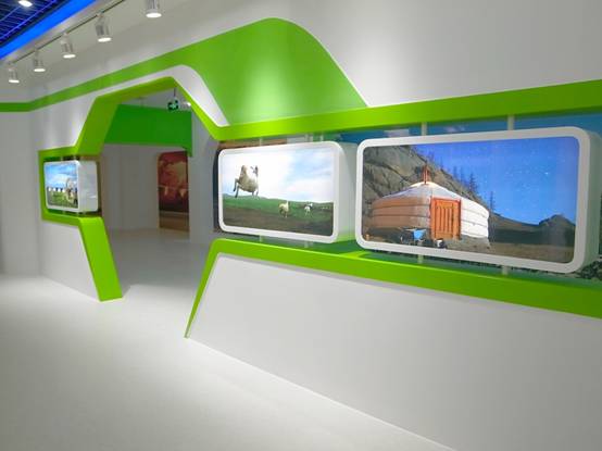 : 上海西郊國際內(nèi)蒙古館現(xiàn)場實景圖,現(xiàn)場分為展示區(qū)和體驗區(qū),展示區(qū)以產(chǎn)品展示銷售為主,現(xiàn)代科技結(jié)合時尚展廳設計風格,藍綠白相結(jié)合,映襯藍天、白云、草原;體驗區(qū)突出體驗品嘗、商務洽談功能,以現(xiàn)代蒙古包造型設計,突出民族氣息,展現(xiàn)內(nèi)蒙古特色。
