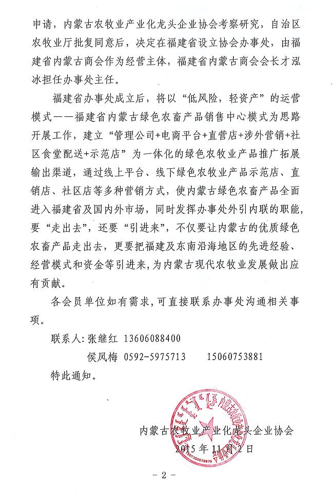 關(guān)于成立內(nèi)蒙古農(nóng)牧業(yè)產(chǎn)業(yè)化龍頭企業(yè)協(xié)會(huì)福建省辦事處的通知