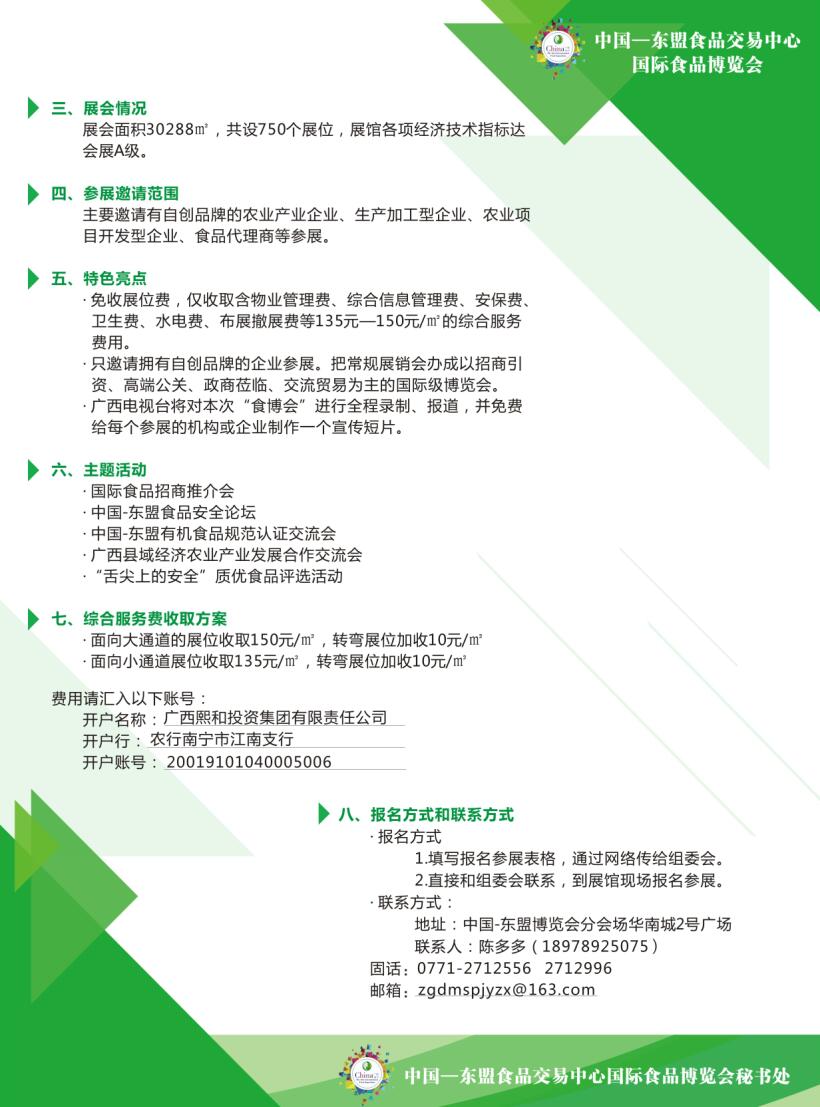 2)本次“博覽會”將同時舉辦“首屆中國-東盟食品安全論壇”和