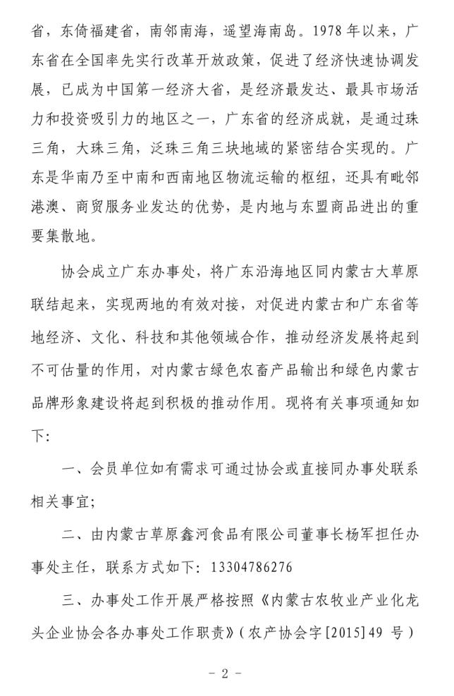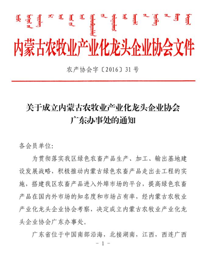 關于成立內(nèi)蒙古農(nóng)牧業(yè)產(chǎn)業(yè)化龍頭企業(yè)協(xié)會廣東辦事處的通知
