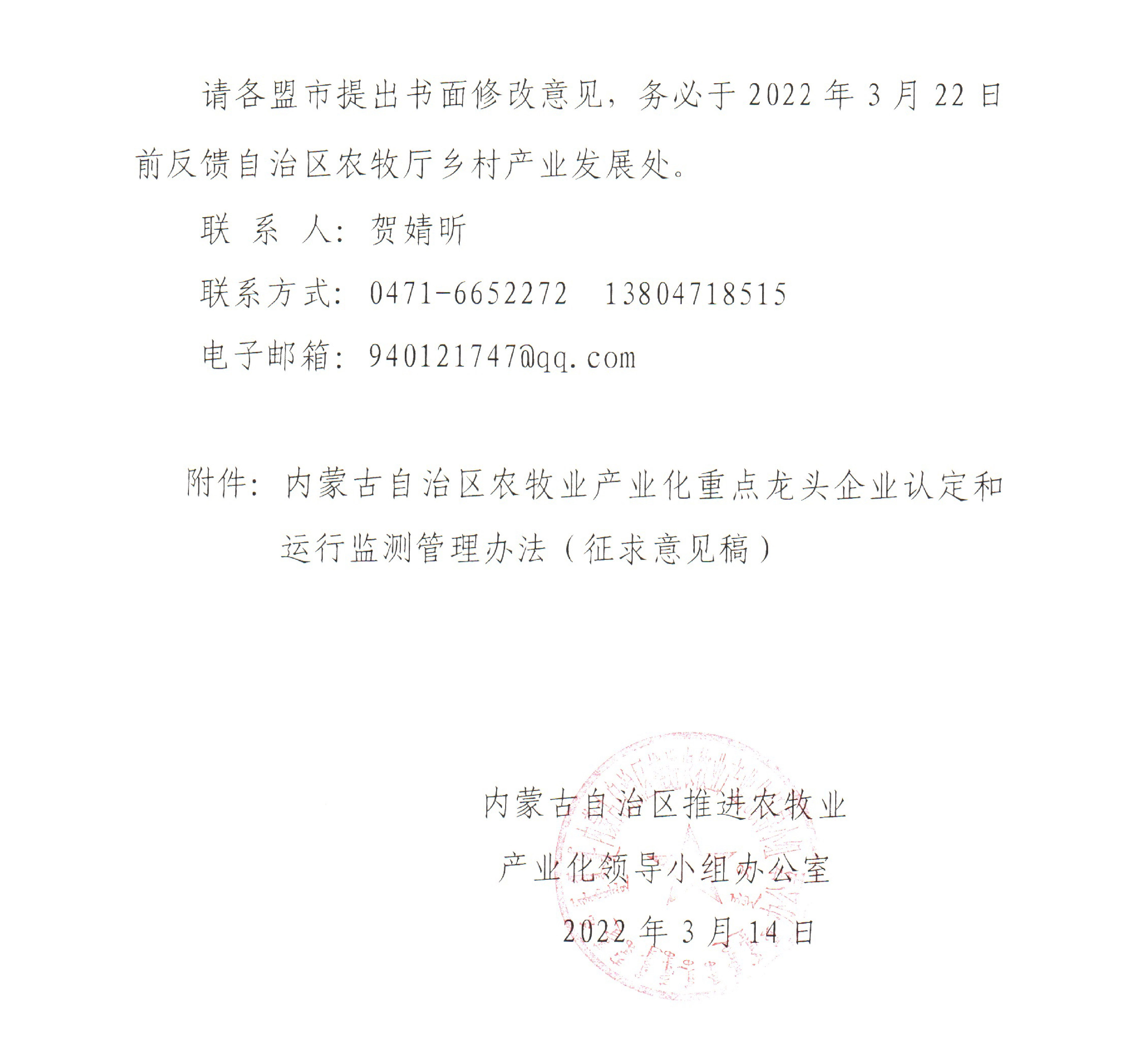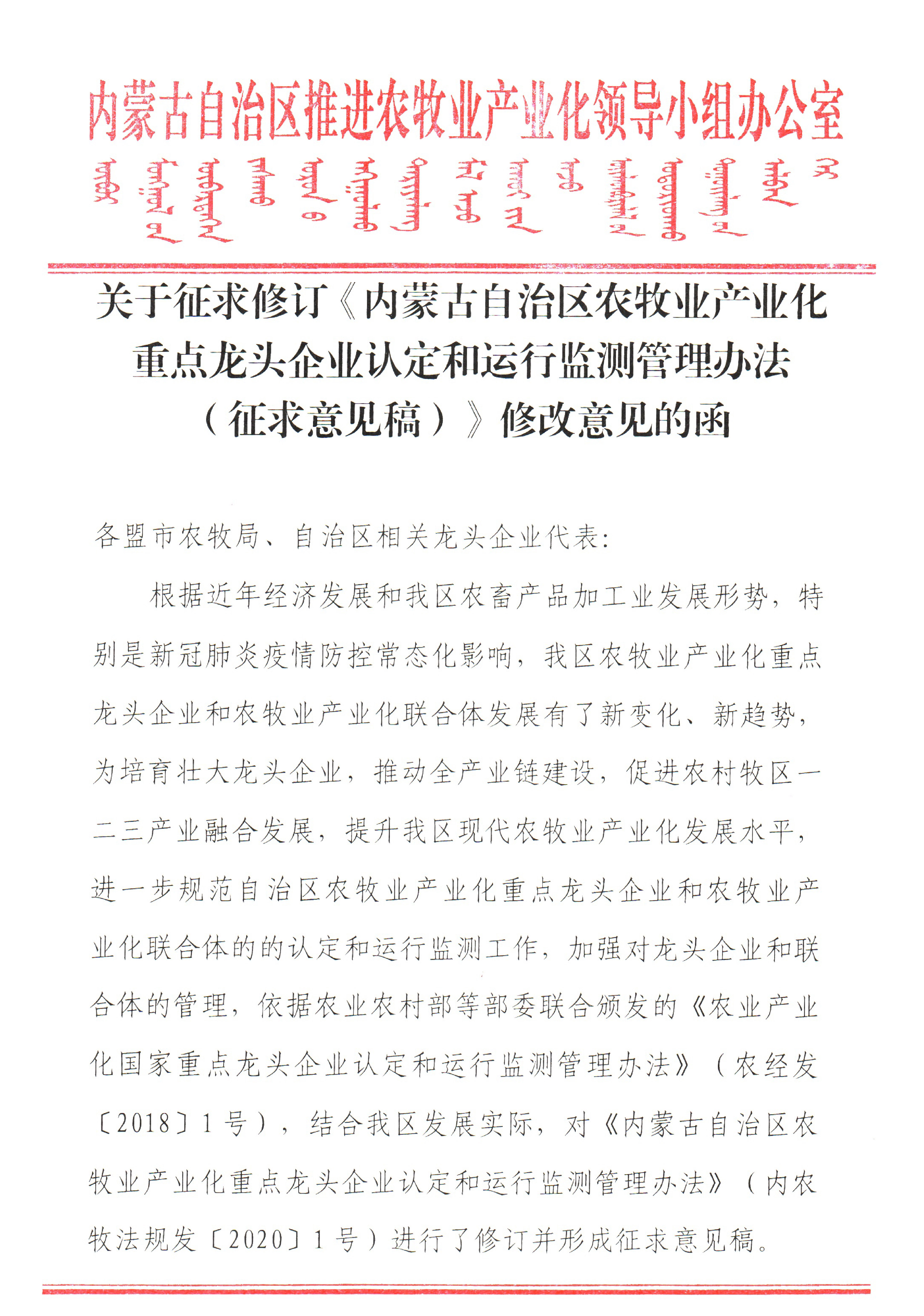 關(guān)于征求修訂《內(nèi)蒙古自治區(qū)農(nóng)牧業(yè)產(chǎn)業(yè)化重點(diǎn)龍頭企業(yè)認(rèn)定和運(yùn)行監(jiān)測(cè)管理辦法(征求意見稿)》修改意見的函