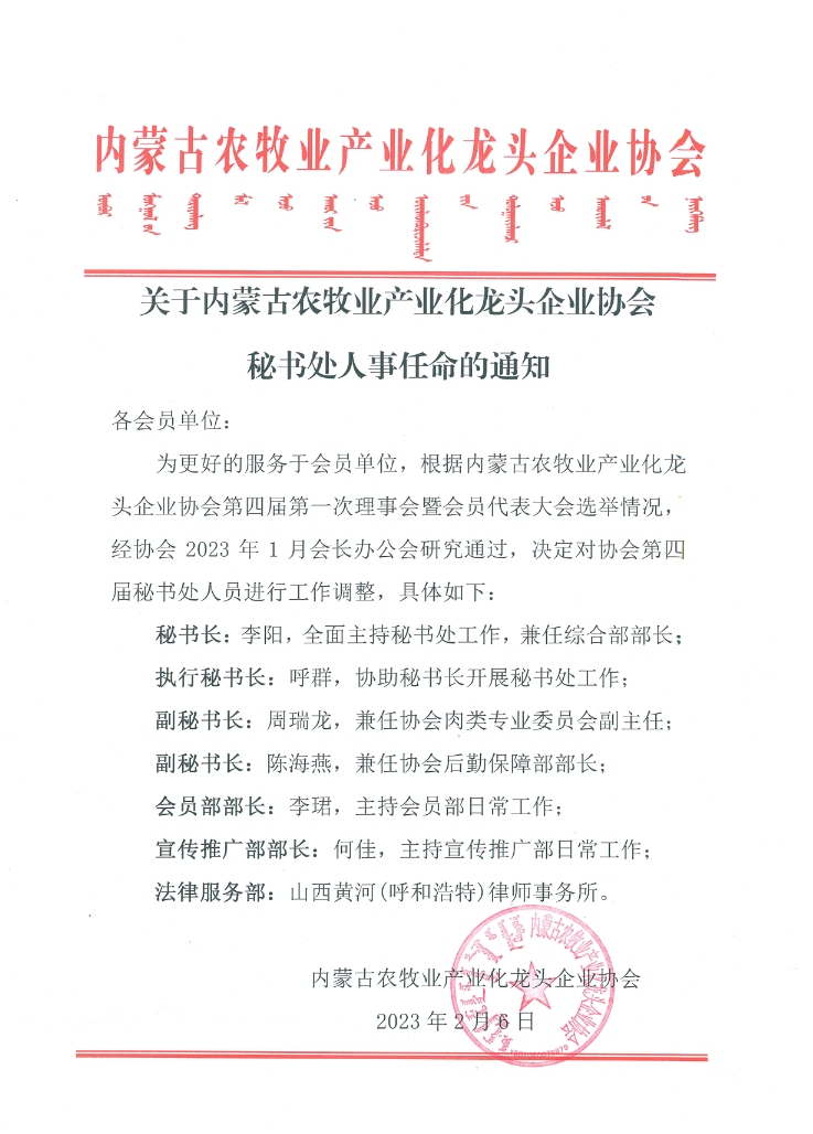 關于內(nèi)蒙古農(nóng)牧業(yè)產(chǎn)業(yè)化龍頭企業(yè)協(xié)會秘書處人事任命的通知