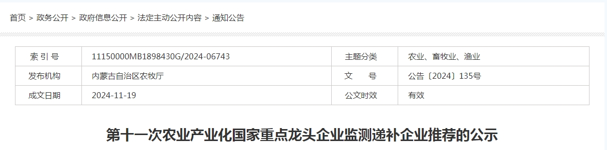 根據(jù)《農(nóng)業(yè)農(nóng)村部辦公廳關(guān)于開展農(nóng)業(yè)產(chǎn)業(yè)化國家重點龍頭企業(yè)企業(yè)監(jiān)測工作的通知》(農(nóng)辦產(chǎn)〔2024〕6號)和《農(nóng)業(yè)產(chǎn)業(yè)化國家重點龍頭企業(yè)認(rèn)定和運行監(jiān)測管理辦法》(農(nóng)經(jīng)發(fā)〔2018〕1號)規(guī)定,立足我區(qū)農(nóng)牧業(yè)產(chǎn)業(yè)發(fā)展實際,我區(qū)開展了第十一次農(nóng)業(yè)產(chǎn)業(yè)化國家重點龍頭企業(yè)監(jiān)測審核和遞補(bǔ)推薦工作。經(jīng)第三方機(jī)構(gòu)審核、專家評審、相關(guān)九部門單位會議審查,擬推薦呼倫貝爾農(nóng)墾集團(tuán)有限公司、巴彥淖爾市圣牧高科生態(tài)草業(yè)有限公司、內(nèi)蒙古騎士乳業(yè)集團(tuán)股份有限公司、莫力達(dá)瓦達(dá)斡爾族自治旗沃豐生物質(zhì)新材料有限公司、內(nèi)蒙古阜豐生物科技有限公司5家企業(yè)遞補(bǔ)農(nóng)業(yè)產(chǎn)業(yè)化國家重點龍頭企業(yè)。