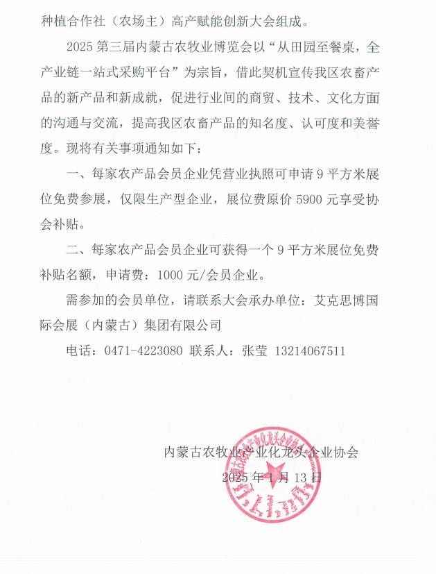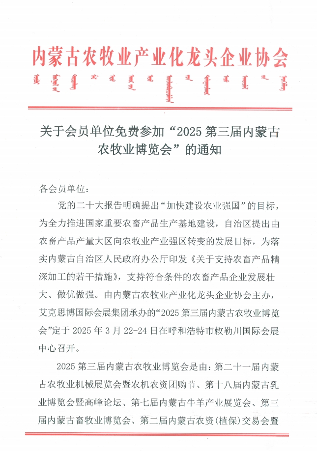 關(guān)于會員單位免費參加“2025第三屆內(nèi)蒙古農(nóng)牧業(yè)博覽會”的通知