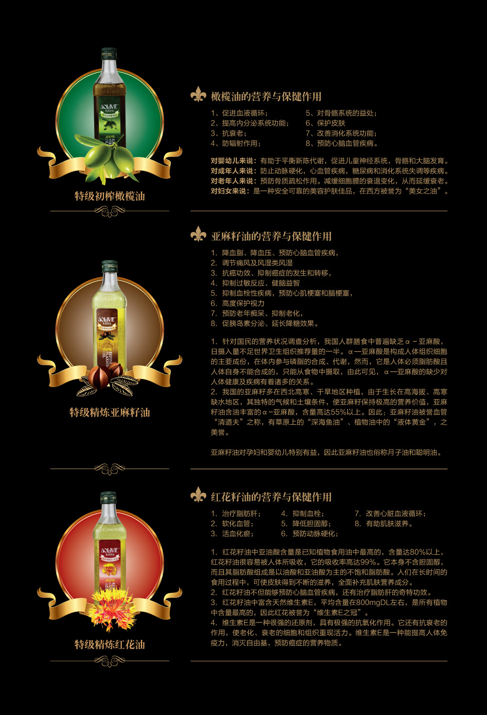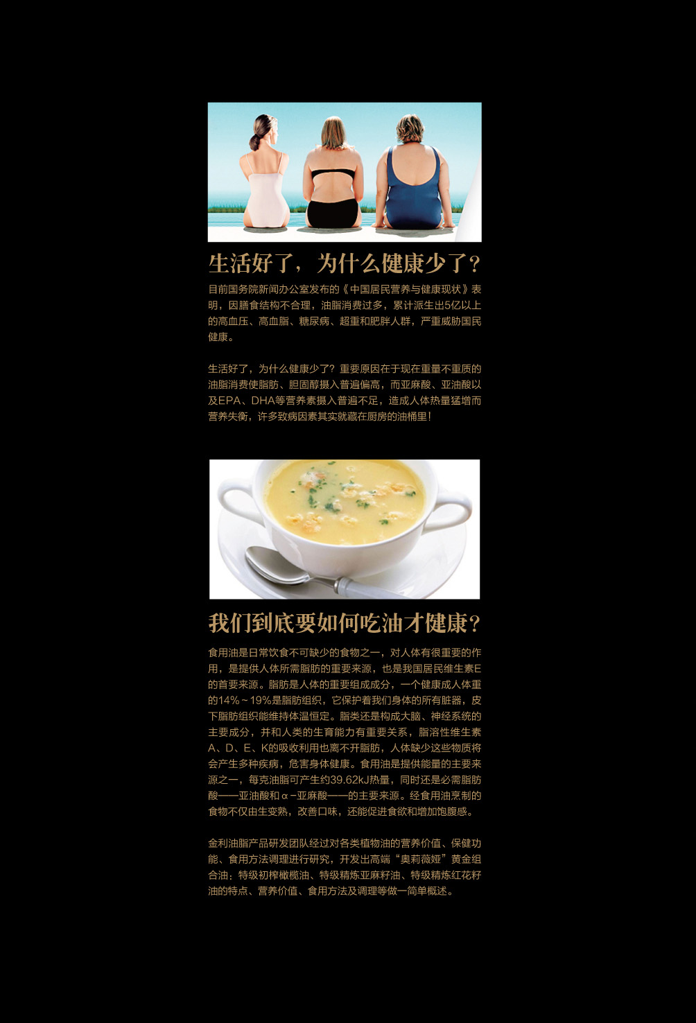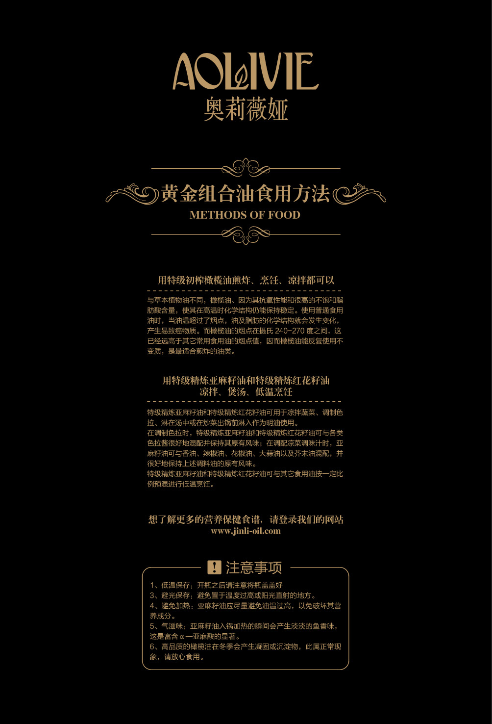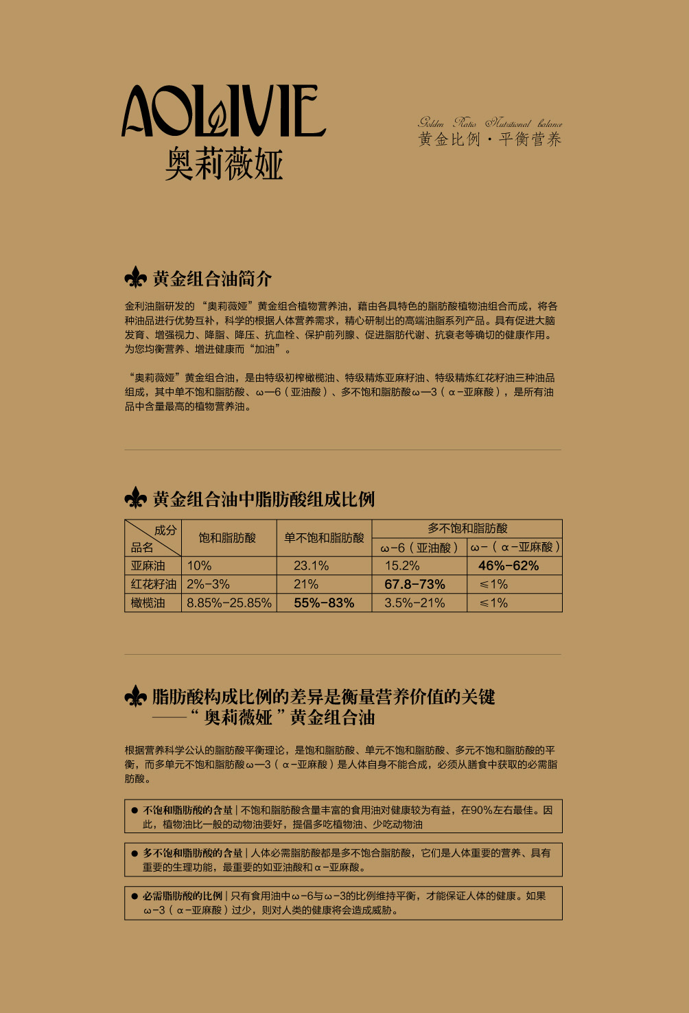 金利油脂(蘇州)有限公司研發(fā)的:“奧莉薇婭黃金組合植物營養(yǎng)油,有各具特色的脂肪酸植物油組合而成,將各種油品進行優(yōu)勢互補,科學的根據人體營養(yǎng)需求,精心研制出的高端油脂系列產品。具有促進大腦發(fā)育/增強視力/降脂/降血壓/抗血栓/保護前列腺/促進脂肪代謝/抗衰老等良好的保健作用。為您均衡營養(yǎng)/增強體質而“加油”?!皧W莉薇婭黃金組合油,是有特級初榨橄欖油/特級冷榨亞麻籽油/特級精煉紅花籽油三種油品組成,其中單不飽和脂肪酸/α—亞麻酸和亞油酸,是所有植物油中含量最高植物營養(yǎng)油。