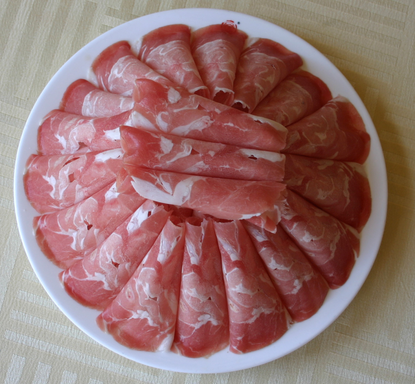 一、   羊肉坯:選用原料:精選上腦、前腿、后腿,按肉紋方向一致、肥瘦搭配均勻,碼制而成。其特點(diǎn)紅白相間、外表美觀、上盤的產(chǎn)品美觀。