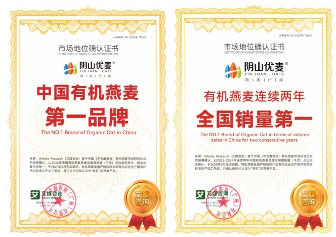 在產(chǎn)品端,陰山優(yōu)麥以“有機(jī)、國產(chǎn)、鮮糧”為核心定位,圍繞“燕麥+”戰(zhàn)略研發(fā)了主食、沖調(diào)等五大系列70余款產(chǎn)品。同時聚焦有機(jī)燕麥片細(xì)分賽道,針對高端人群需求,打造品質(zhì)差異化。明星單品“有機(jī)大粒燕麥片”憑借天然有機(jī)、當(dāng)季新糧、無添加等優(yōu)勢,累計銷量近300萬桶,連續(xù)四年蟬聯(lián)全網(wǎng)有機(jī)麥片銷量冠軍,并獲評艾媒咨詢“2024年度影響力爆品獎”,贏得了眾多消費(fèi)者的喜愛和信賴。2025年3月12日, 陰山優(yōu)麥憑借其在有機(jī)燕麥領(lǐng)域的全產(chǎn)業(yè)鏈布局、規(guī)?;N植優(yōu)勢及市場領(lǐng)導(dǎo)地位,獲得全球權(quán)威機(jī)構(gòu)艾媒咨詢(iiMedia Research)頒發(fā)的“中國有機(jī)燕麥第一品牌”市場地位確認(rèn)證書。同時,公司旗下有機(jī)燕麥產(chǎn)品連續(xù)兩年(2023-2024年)穩(wěn)居全國銷量第一,進(jìn)一步鞏固了其有機(jī)燕麥行業(yè)領(lǐng)軍者的地位。
